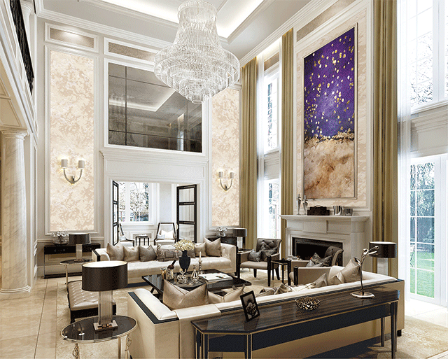 歐式(shi)客廳頂部(bu)喜用(yong)大(da)型燈池,并用(yong)華麗的(de)枝形吊燈營(ying)造(zao)氣(qi)氛。們(men)窗上半部(bu)多(duo)做成(cheng)圓弧形,并用(yong)帶有(yǒu)花(huā)紋的(de)石膏線(xiàn)勾邊。室內(nei)有(yǒu)真正的(de)壁爐或假壁爐造(zao)型。牆面一(yi)般使用(yong)高(gao)檔藝術(shù)壁材(cai),或優(you)質(zhi)環保的(de)藝術(shù)塗料,如造(zao)型多(duo)樣的(de)大(da)寶L’opera樓貝進(jin)口藝術(shù)塗料,來烘托豪華效果。
